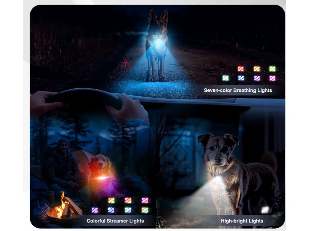 Nočné osvetlenie prijímača: tri režimy svetla (dúhové dýchanie, prúdové efekty, vysoká intenzita) uľahčujú viditeľnosť psa aj po zotmení.